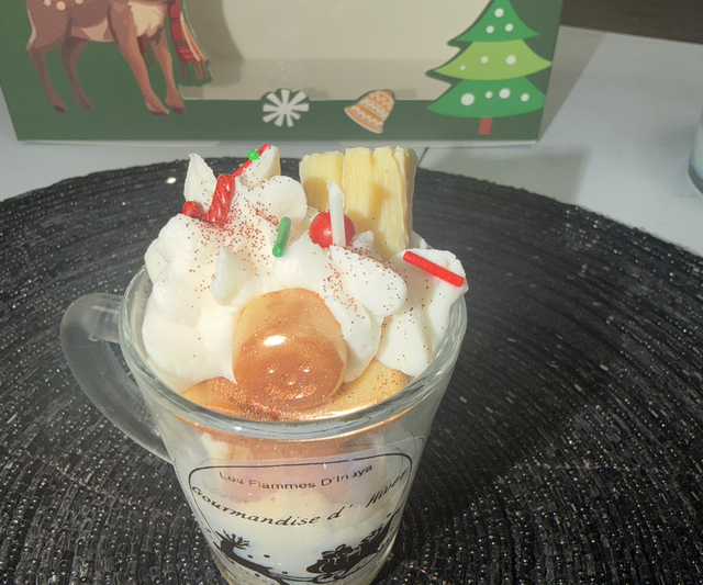 Présentée dans une tasse transparente, elle dévoile une chantilly de cire généreuse, décorée de petites meringues, de vermicelles rouges et verts, et d’un adorable ourson en cire cuivrée façon bonbon de Noël 🍬